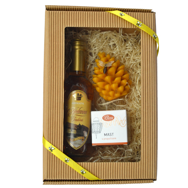 Darčekové balenie L2 obsahuje medovinu, kozmetiku a sviečku zo včelieho vosku.