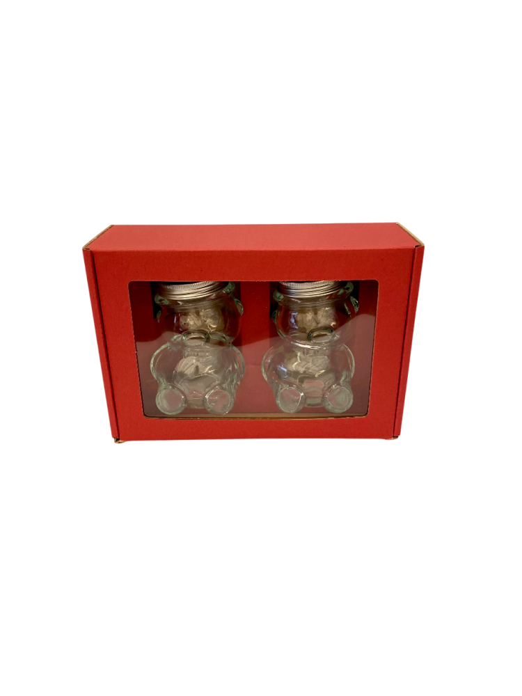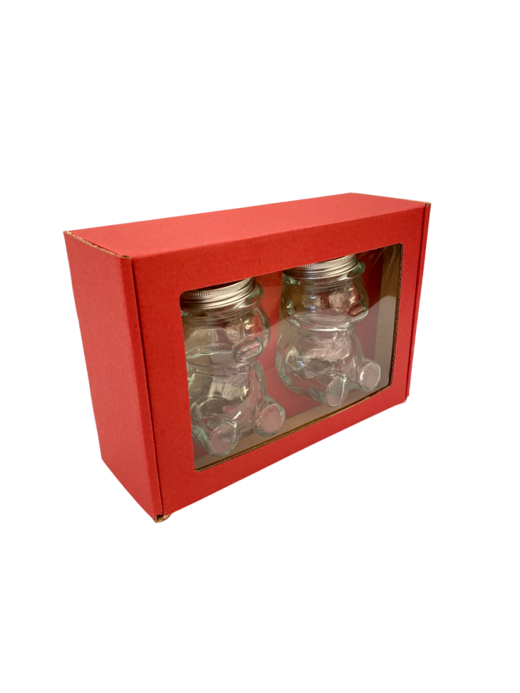Toto balenie je určené na darčekové alebo prezentačné účely. Pojme 2 kusy sklenených pohárov v tvare medvedíka s objemom 220 g medu (typ MACKO10).