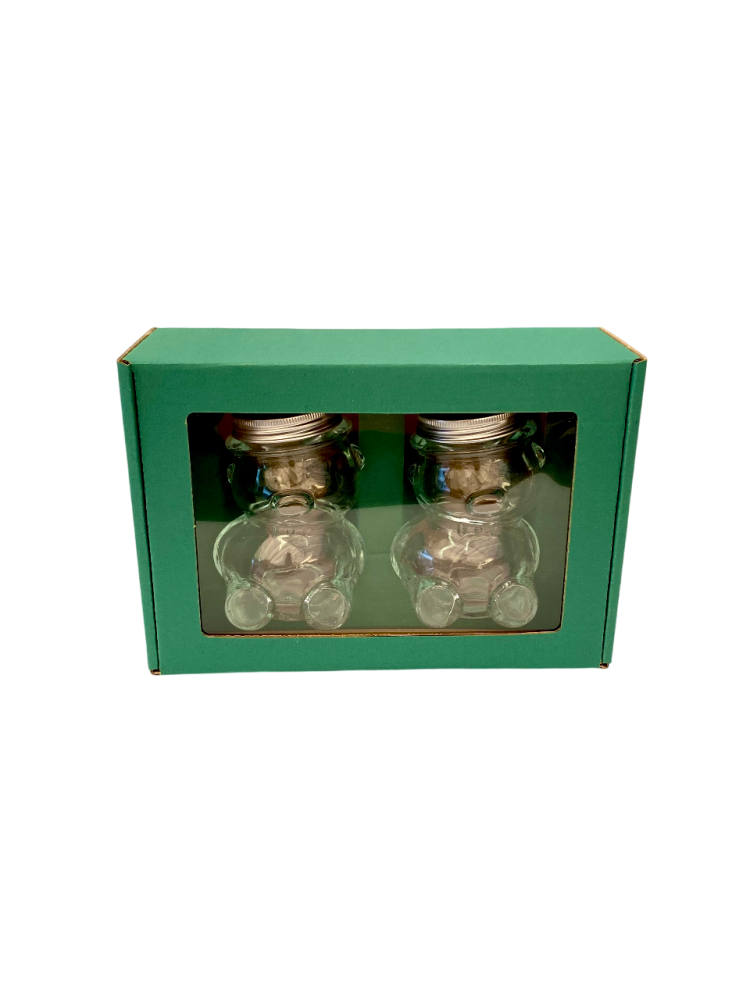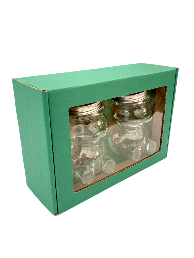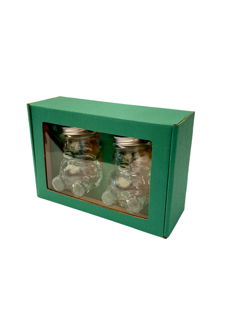 Toto balenie je určené na darčekové alebo prezentačné účely. Pojme 2 kusy sklenených pohárov v tvare medvedíka s objemom 220 g medu (typ MACKO10).