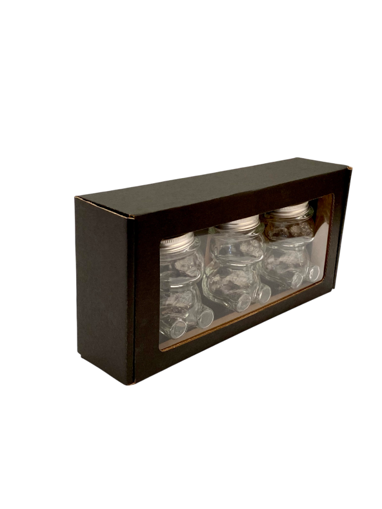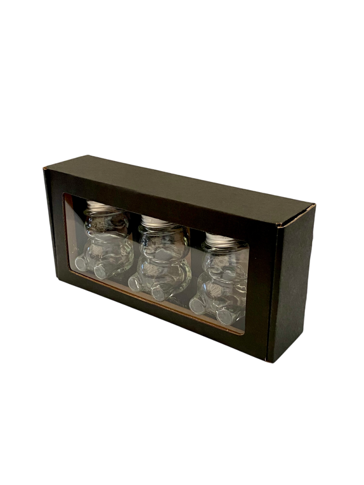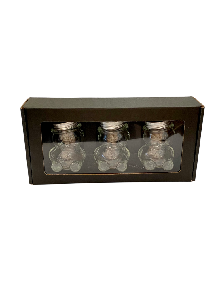 Toto balenie je určené na darčekové alebo prezentačné účely. Pojme 3 kusy sklenených pohárov v tvare medvedíka s objemom 100 g medu (typ MACKO10).