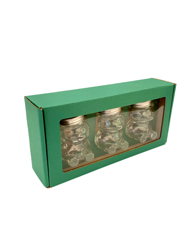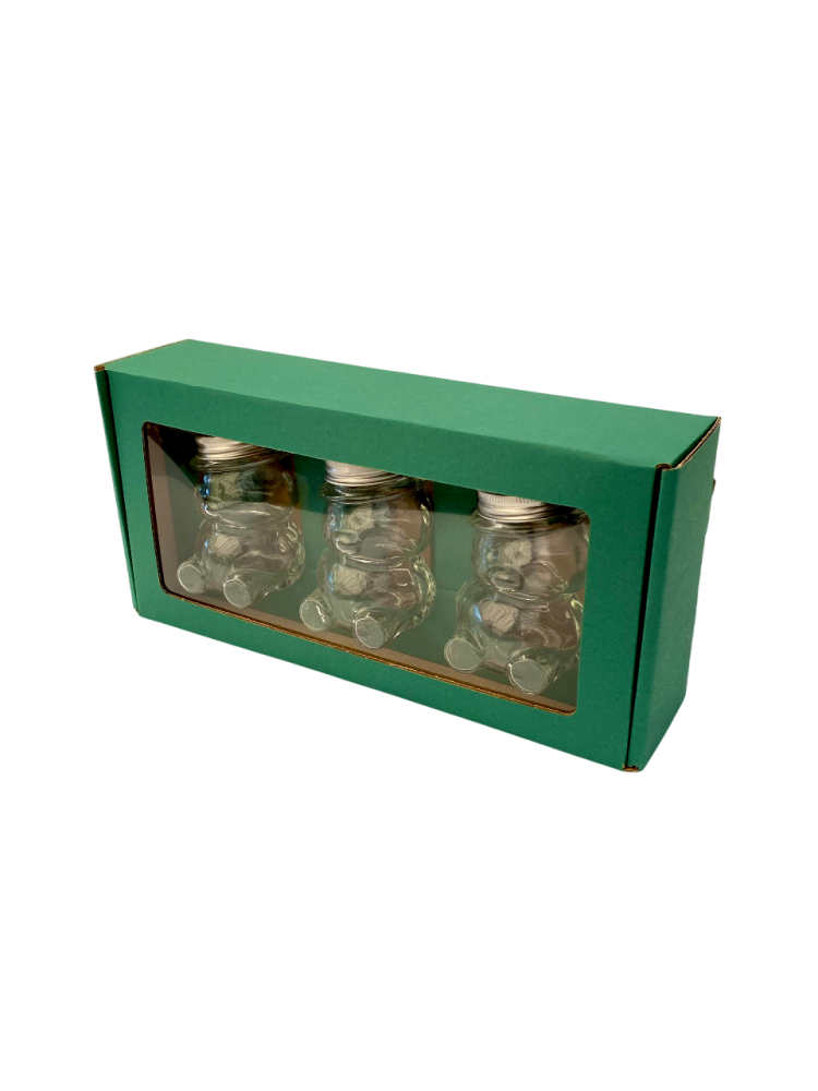 Toto balenie je určené na darčekové alebo prezentačné účely. Pojme 3 kusy sklenených pohárov v tvare medvedíka s objemom 100 g medu (typ MACKO10).