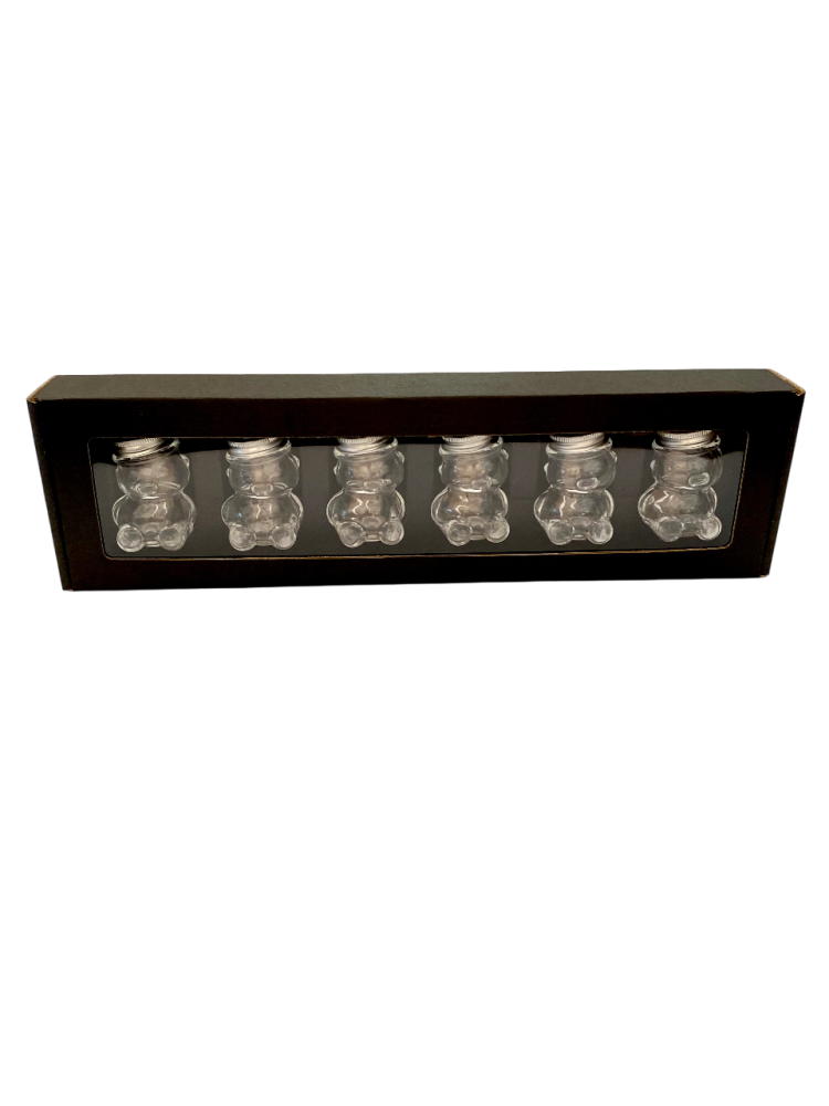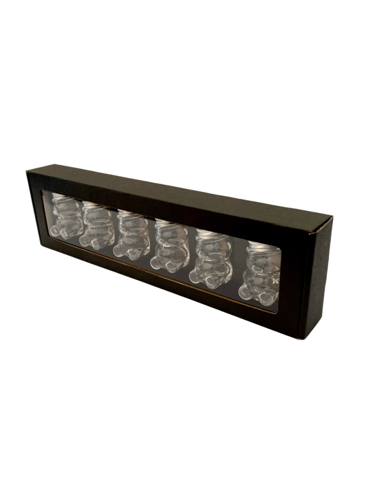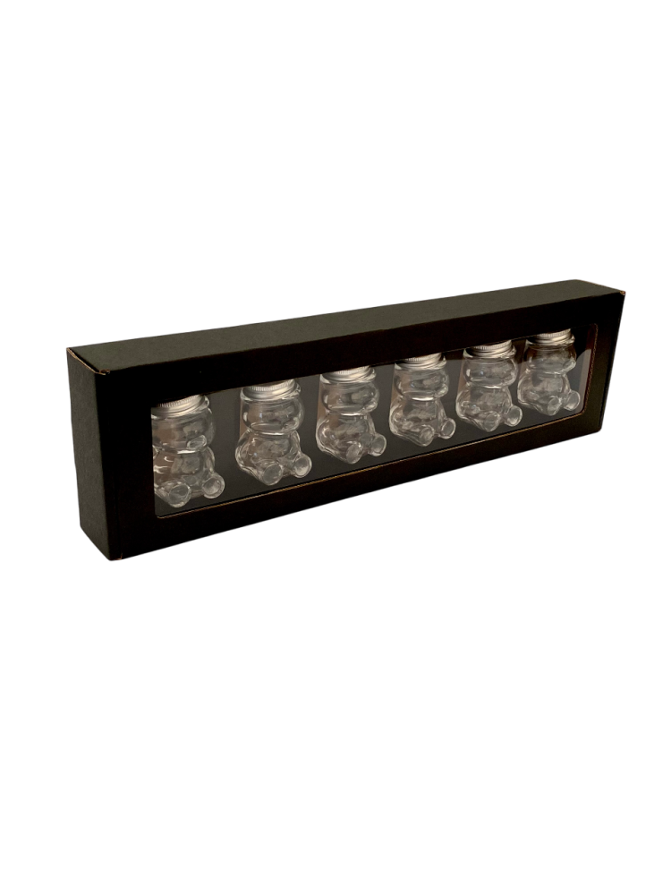 Toto balenie je určené na darčekové alebo prezentačné účely. Pojme 6 kusov sklenených pohárov v tvare medvedíka s objemom 50 g (typ MACKO5).