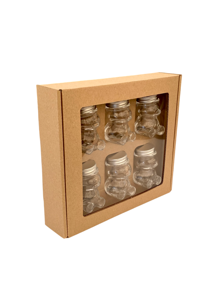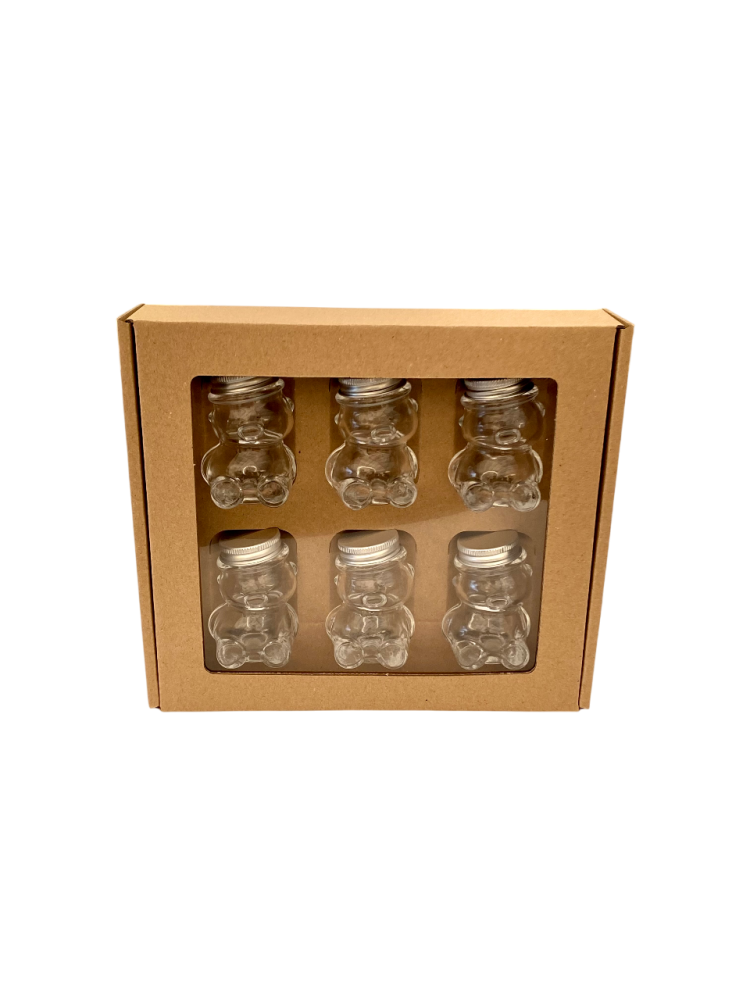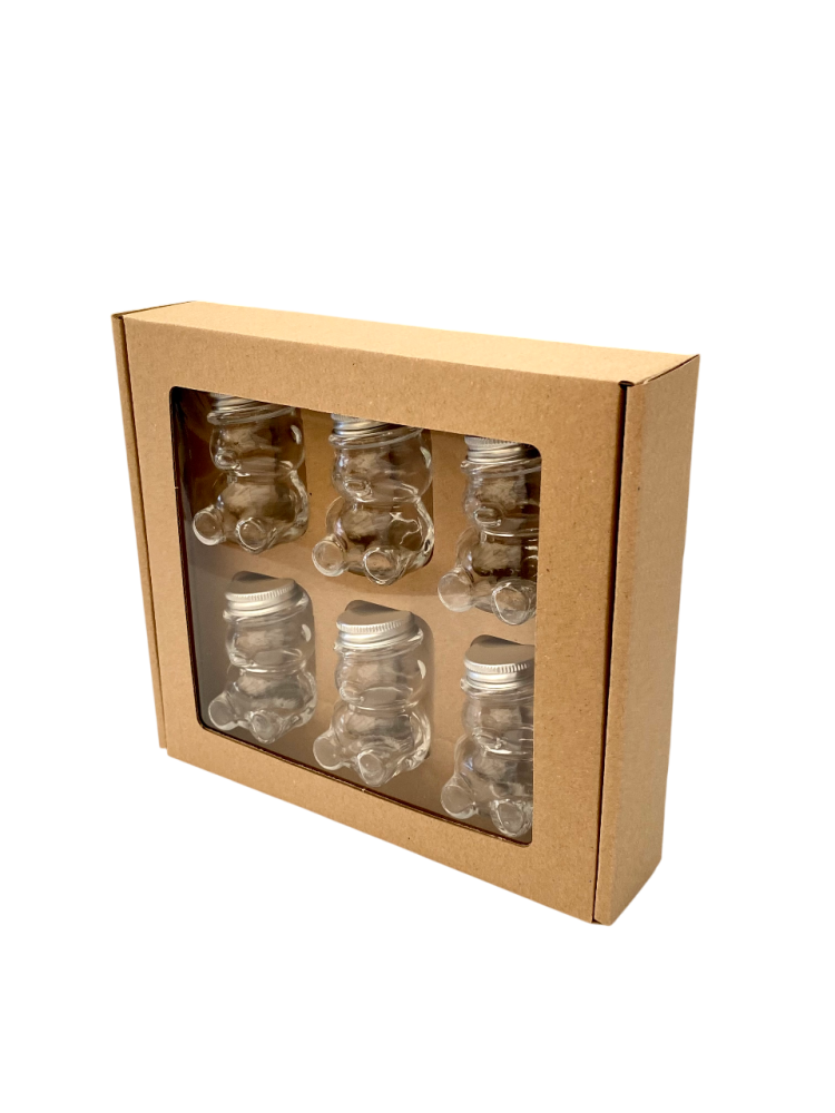 Toto balenie je určené na darčekové alebo prezentačné účely. Pojme 6 kusov sklenených pohárov v tvare medvedíka s objemom 50 g (typ MACKO5).