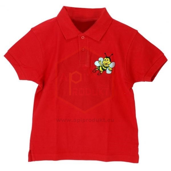 Červená detská polokošeľa so včelárskou výšivkou je vyrábaná z najkvalitnejšej bavlny. S farebnou výšivkou zobrazujúcou letiacu včelu medonosnú.