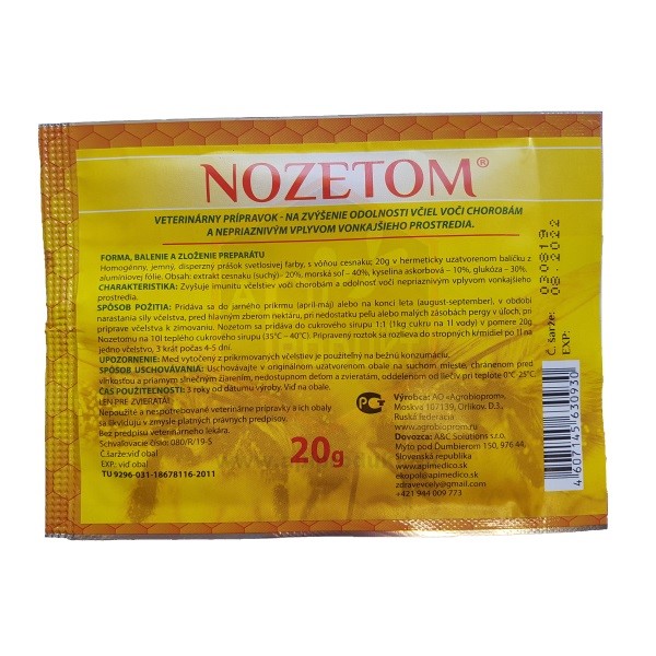 NOZETOM je koncentrovaný veterinárny prípravok bez veterinárneho predpisu pre včely s obsahom extraktu cesnaku, morskej soli, kyseliny askorbovej a glukózy. Schválený príslušnými štátnymi orgánmi pod registračným číslom 080/R/19-S.