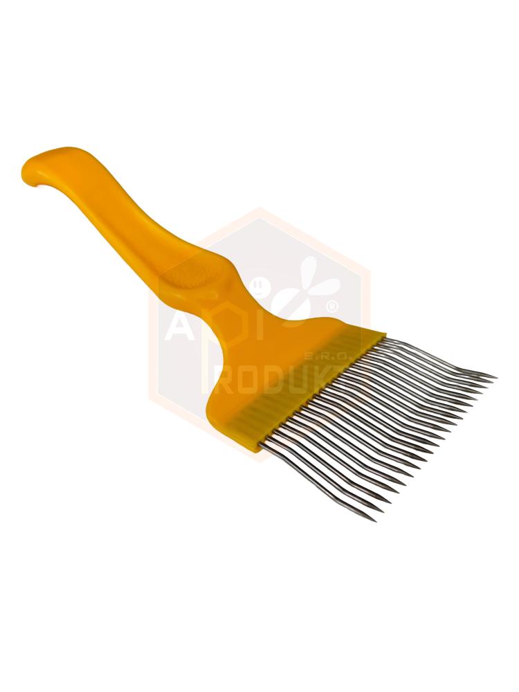 Odviečkovacia vidlička s plastovou rukoväťou má 21 lomených nerezových ihiel. Príjemná plastová rukoväť je anatomicky tvarovaná a dobre sadne do ruky. Vidlička je nepostrádateľná včelárska pomôcka, ktorá zaručuje rýchlu a spoľahlivú prácu pri odviečkovaní plástov.