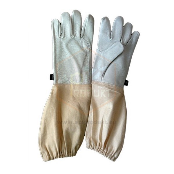Dlhé kožené včelárske rukavice s plátnom sú zhotovené z bravčovej lícovky, čo je mäkký materiál, ktorý včelára pri ich práci neobmedzuje. Otvor v rukaviciach je chránený gumičkou proti vniknutiu včiel do rukáva. Dĺžka plátenej časti je 20 cm.