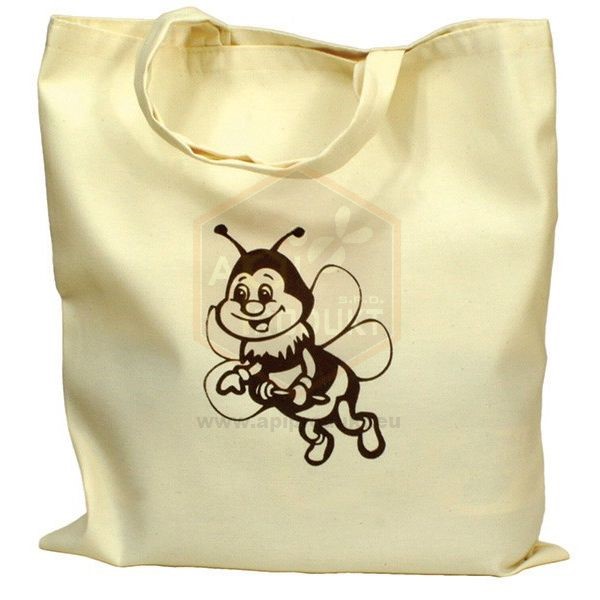 Svetlá ekologická skladacia taška s potlačou včely vhodná napríklad na poháre s medom alebo medovinou.