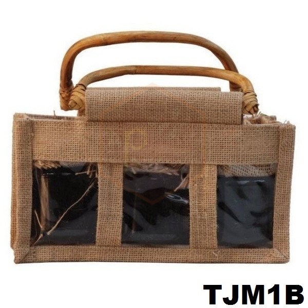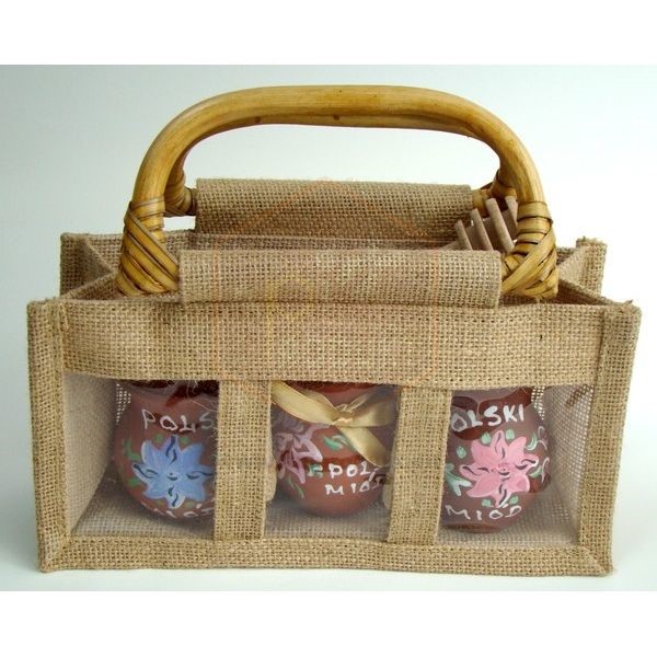 Veľká taška z juty na 3 poháre 300-370 ml s prútenými rúčkami, ktoré dokonale ladia s prírodným materiálom juty. Taška má v prednej časti 3 priehľadné okienka cez ktoré je vidieť umiestnené poháre s medom alebo inými včelími produktami. Široká rúčka 16 cm zabezpečuje pohodlné držanie. Taška nezahŕňa poháre.