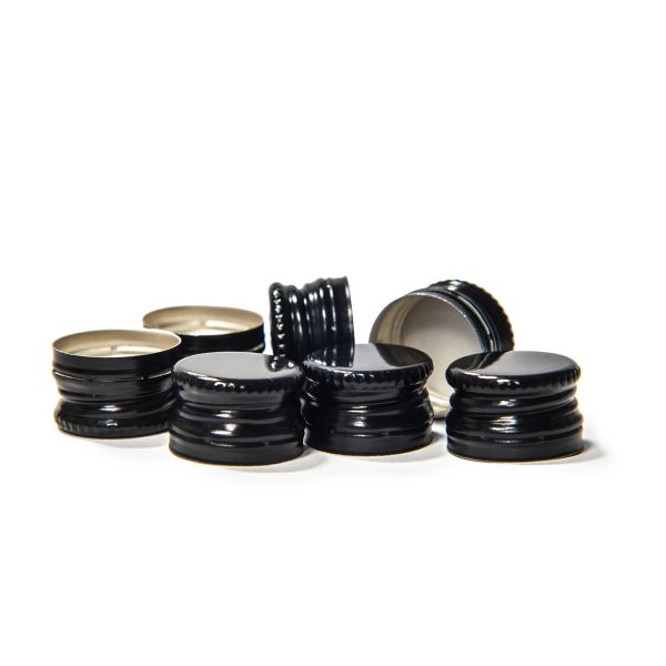 Čierny uzáver PP z hliníkového plechu o veľkosti 18 x 12 mm so závitom a poistným krúžkom AD.