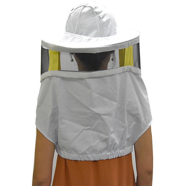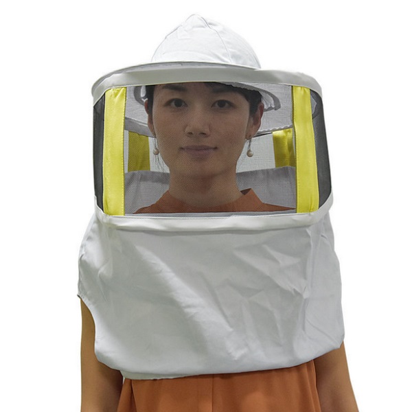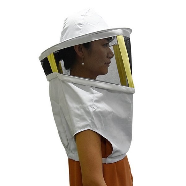 Dlhý včelársky závoj má tvárovú časť chránenú hranatou kovovou mriežkou so sieťovinou, zvyšok tvorí textilný materiál.