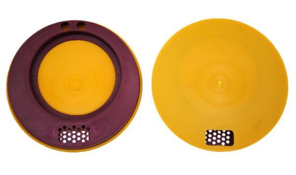 Žltý okrúhly letáčový uzáver s priemerom 50 mm na zakrývanie očiek - otvorov v rôznych zariadeniach pre včely.